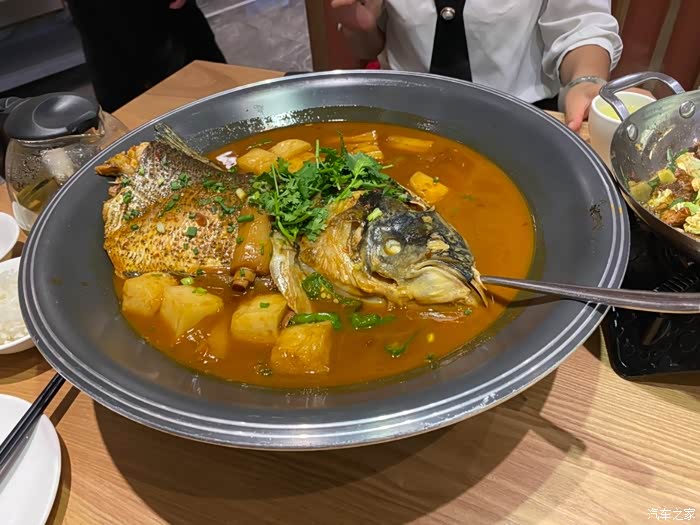 鱼之大,一盆装不下,这道菜不错鱼头年糕,有点微辣,还有点甜丝丝!