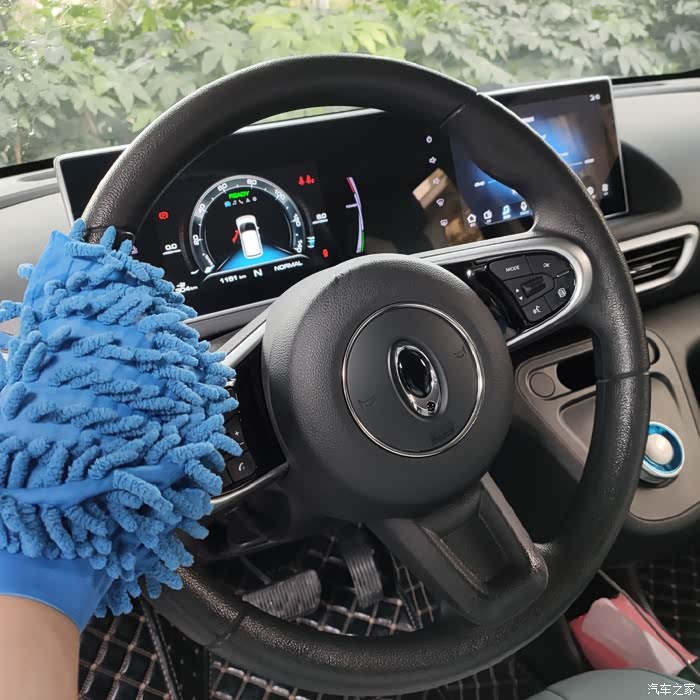 step6.上一部耗时比较长,擦完已经累了。但是还没到冲水的时候,作为自己洗车的老司机,这个时候应该先把抹布洗干净后来擦一擦内饰,不然擦完内饰你会发现有的地方不小心被蹭上了脏水,因为内饰平常打理的也比较勤所以稍微擦擦就行了。
