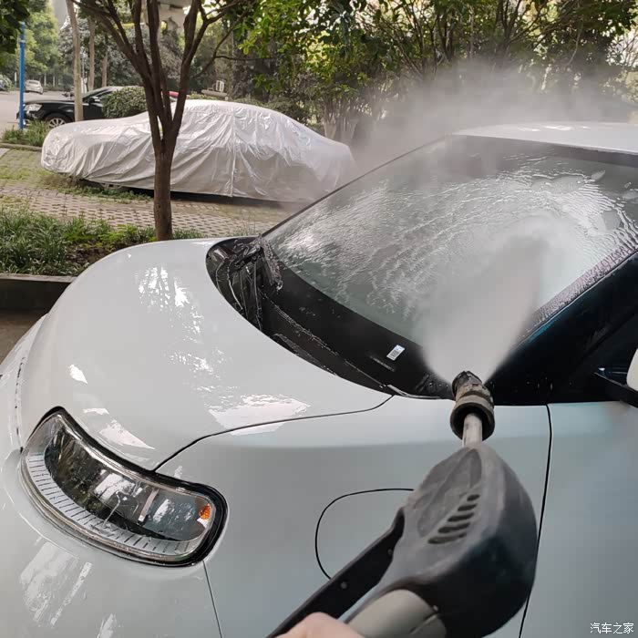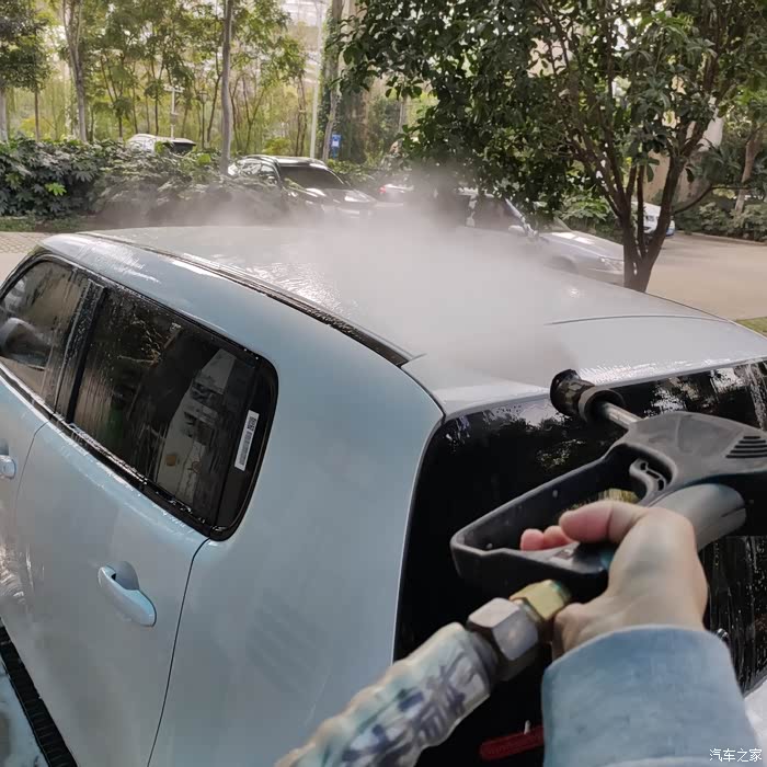 step2. 泡沫枪自上往下冲刷车身,将小白猫除车底外360度全部裹上洗车泡沫。