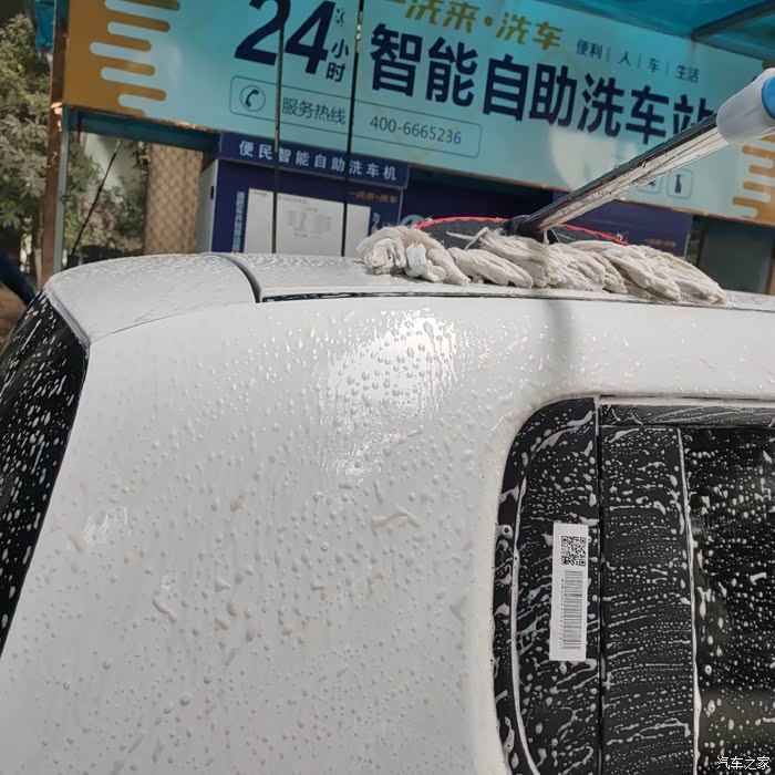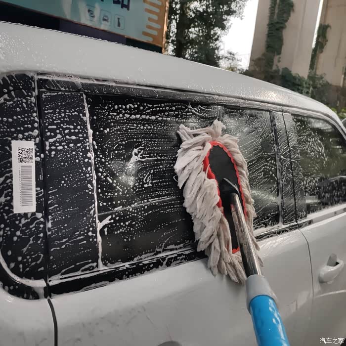 step3.用洗车站公用的洗车拖把自上而下全方位擦洗。车顶一定要洗哦,不然会有脏水从顶上留下来。