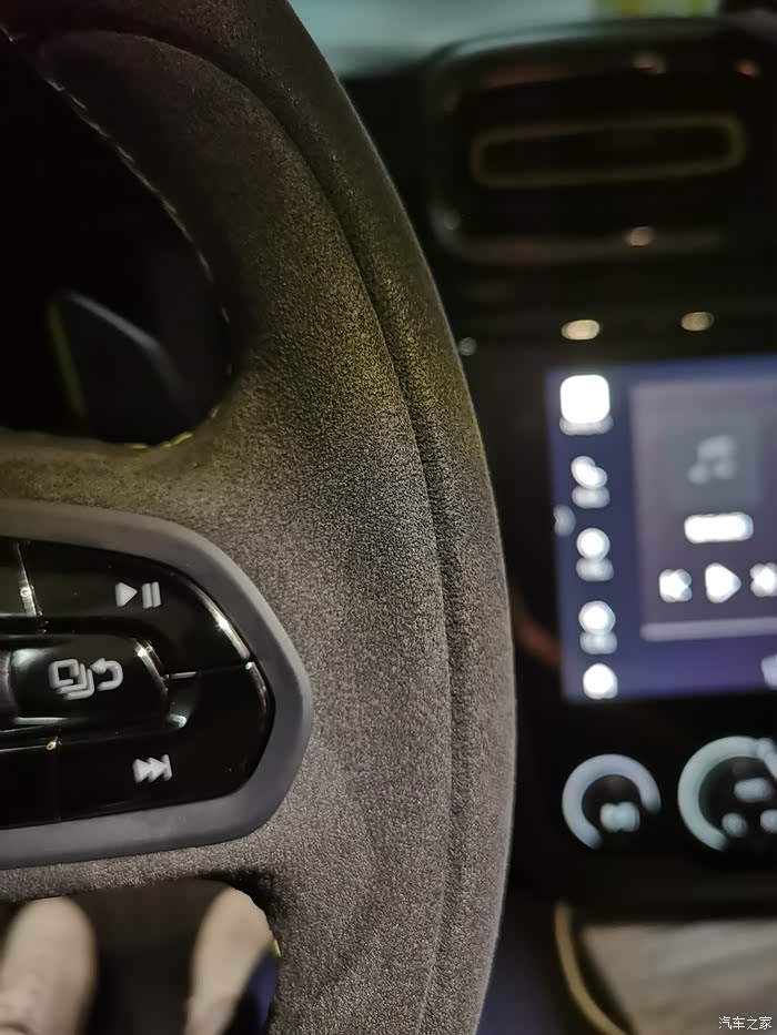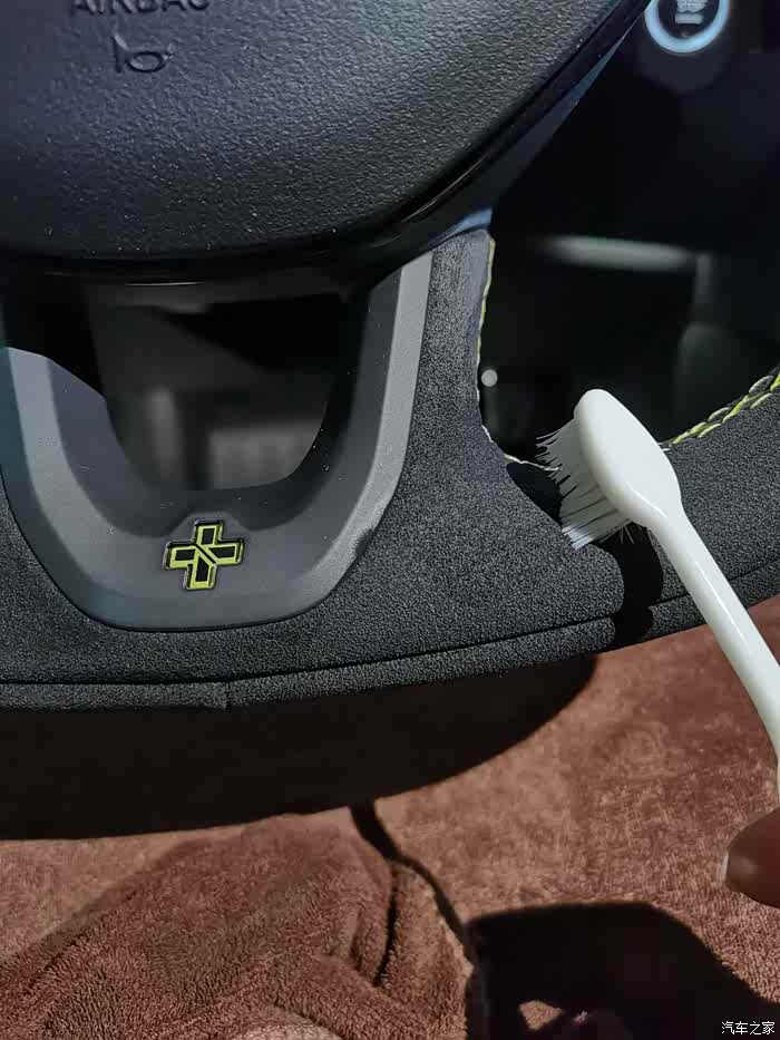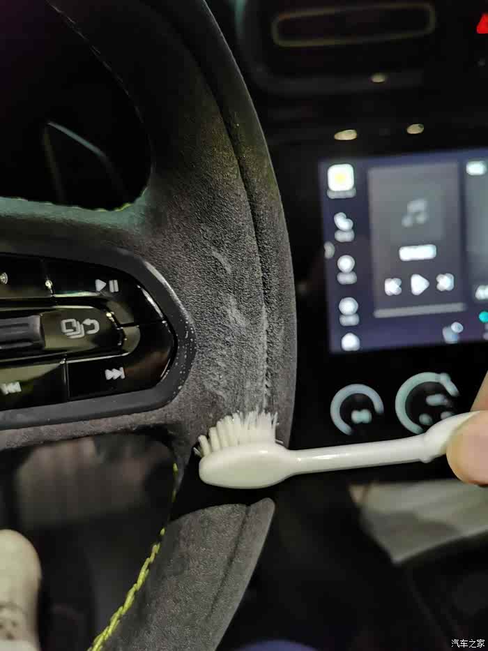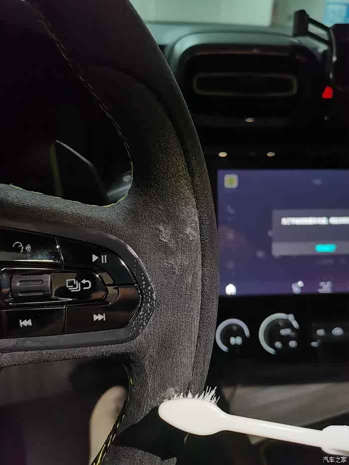 这是已经被我盘了7000公里的方向盘,指甲划过9-3点方向时已经泛起白痕了。原来的绒毛也已经完全趴下了。这时候就需要尽快清洁了。