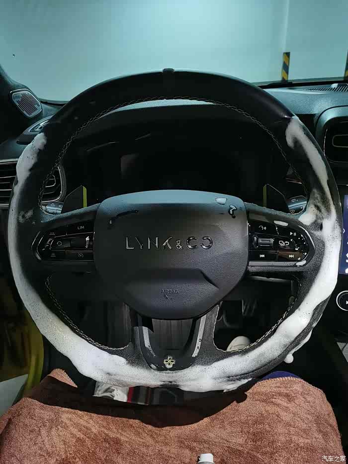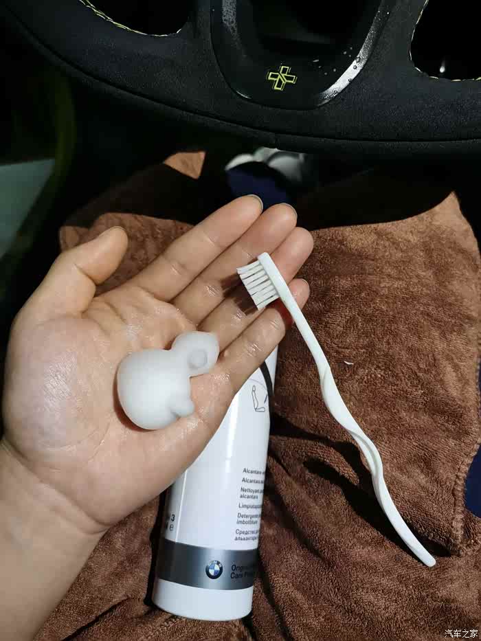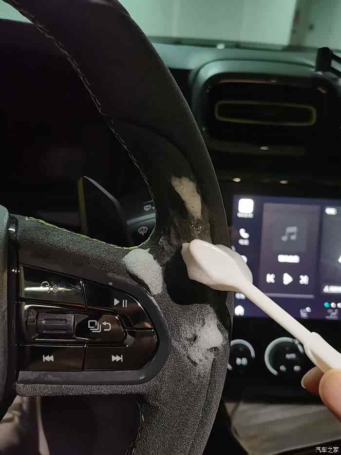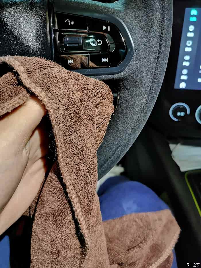 下一步,用湿毛巾轻轻擦洗,主要目的是吸出来尽可能多的清洗剂。可以适当用力握方向盘,利于液体吸出。