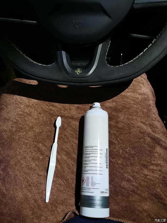 我选择的是在网上淘的专用于Alcantara清洗剂。首先调整座椅,准备2块干净的不掉色的毛巾,小牙刷,和清洗剂。
