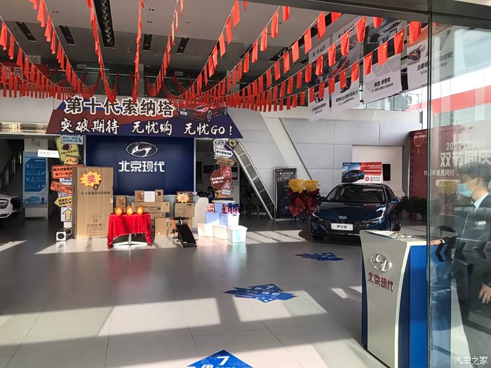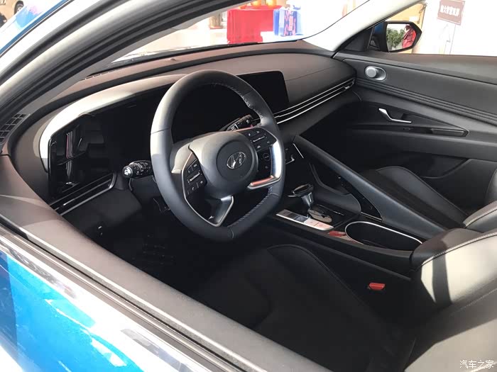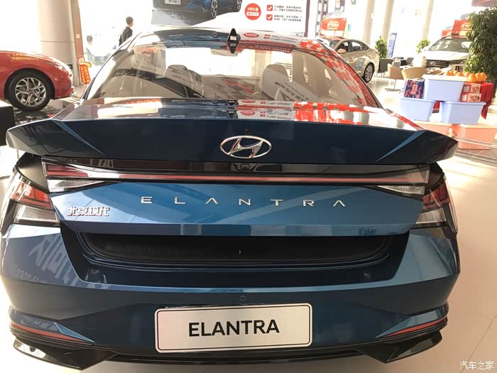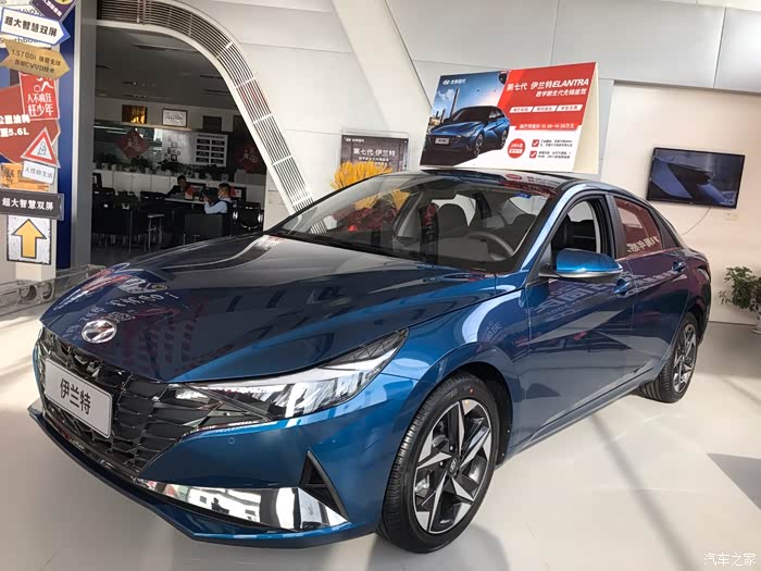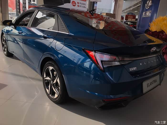还没看完门口的车就被销售顾问引导着进了展厅,一进门右侧就是今天的主角伊兰特了,映入眼帘当然是它的侧面线条,勾勒的非常完美蓝色色调给了我眼前一亮的感觉,给我第一眼的感觉就比网上的图片要好很多,对它的映像也不是那么片面了。
