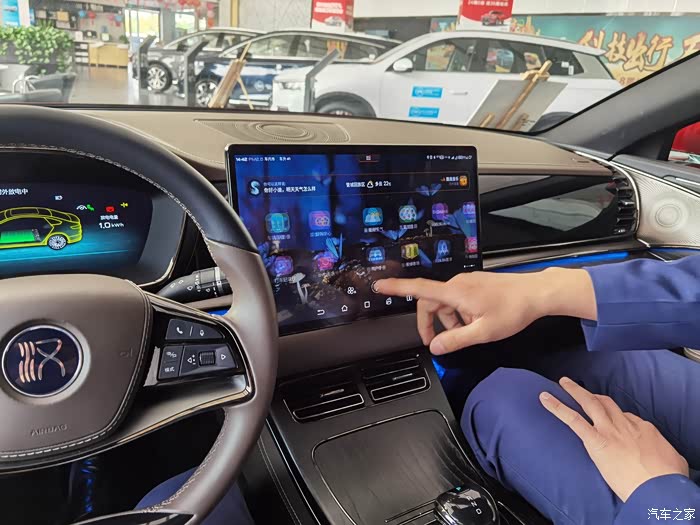 销售小哥在介绍车内功能。这个中控屏真的好大…之前看过宋Pro感觉一个天上一个地下了,语音助手现在也更新到免唤醒了。