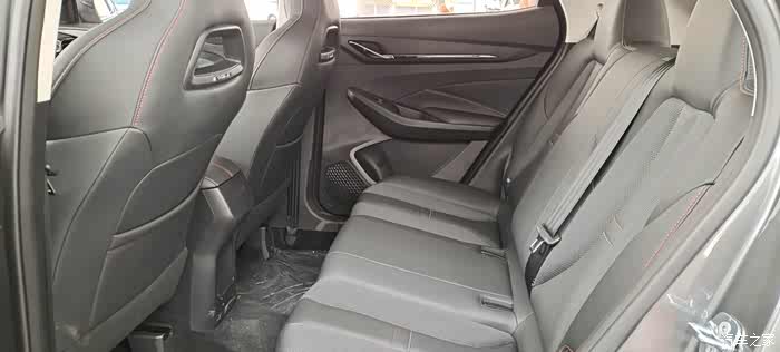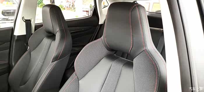 座椅采用赛车一体式座椅,这个是布和皮质混搭的,缝线为红色,在纯黑内饰有这样的搭配也不会给人太单调,试驾过程中座椅包裹性很强,软硬程度适中。