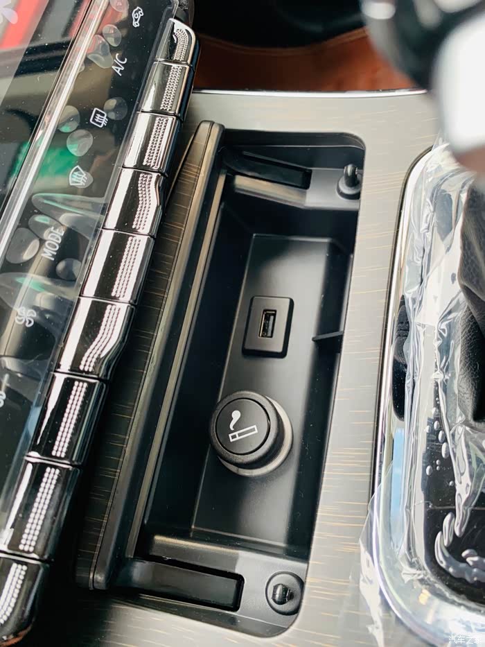 盖子打开里面是点烟器和USB接口。