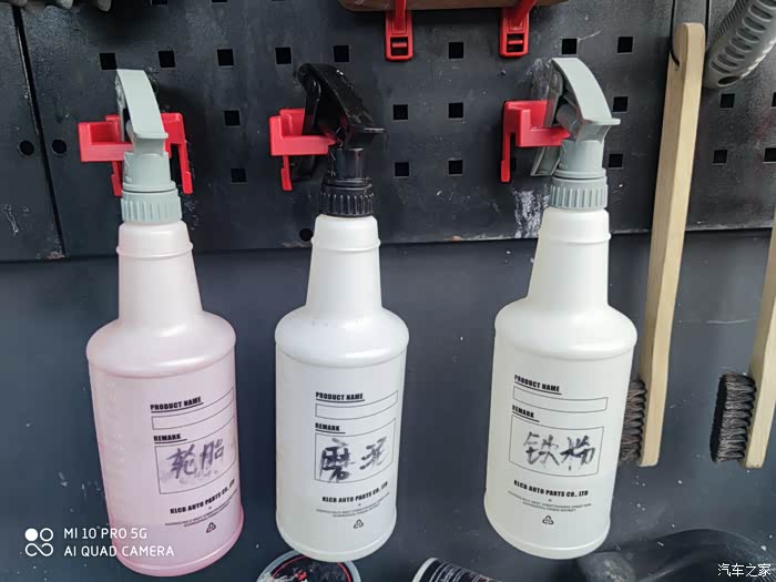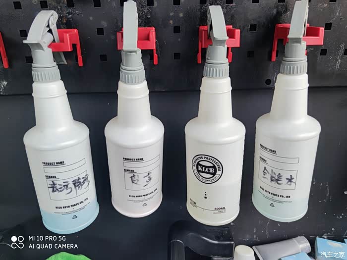 清洗剂分门别类,看的一清二楚,各司其职啊!一方面,说明洗车店专业水准高,另一方面,最大限度的避免作业人员的使用不当。