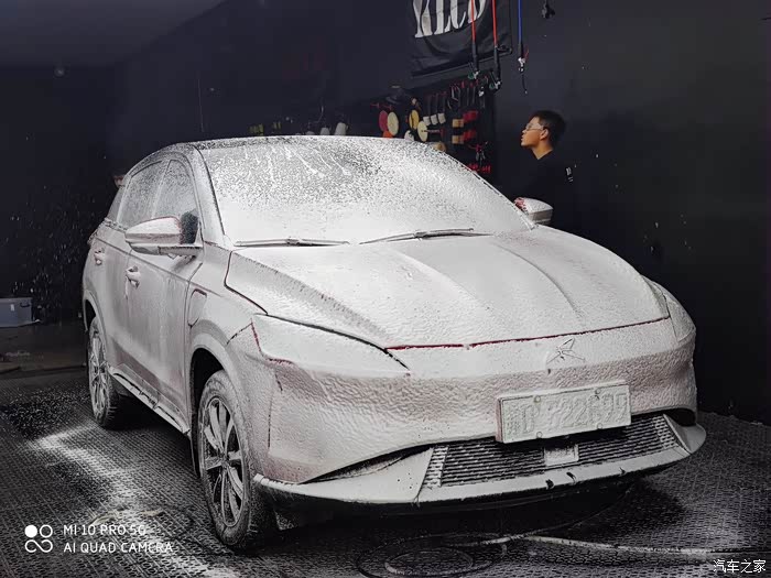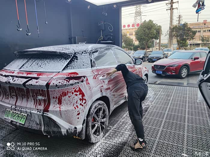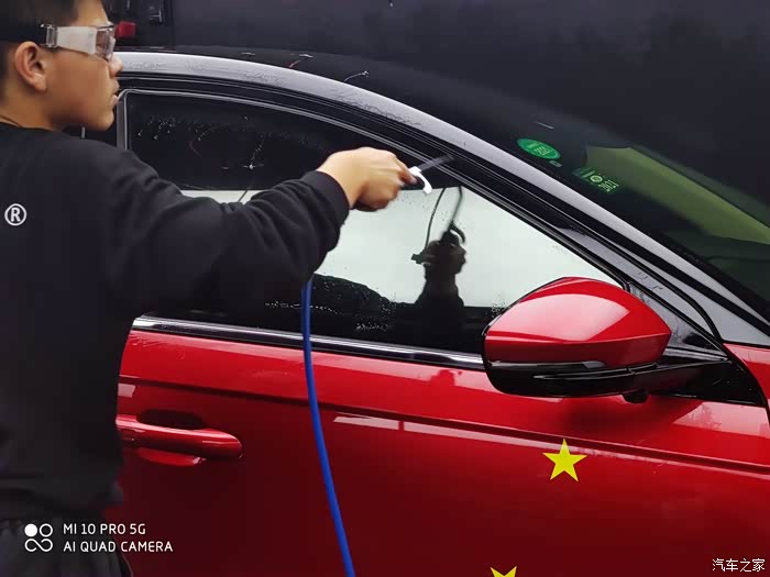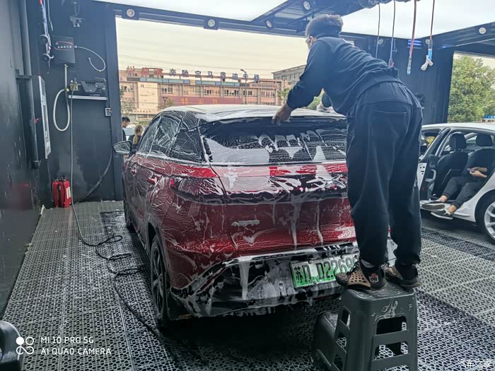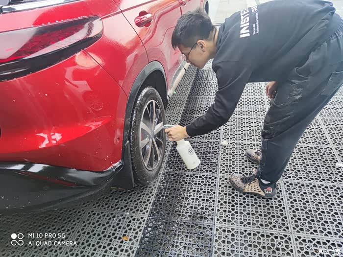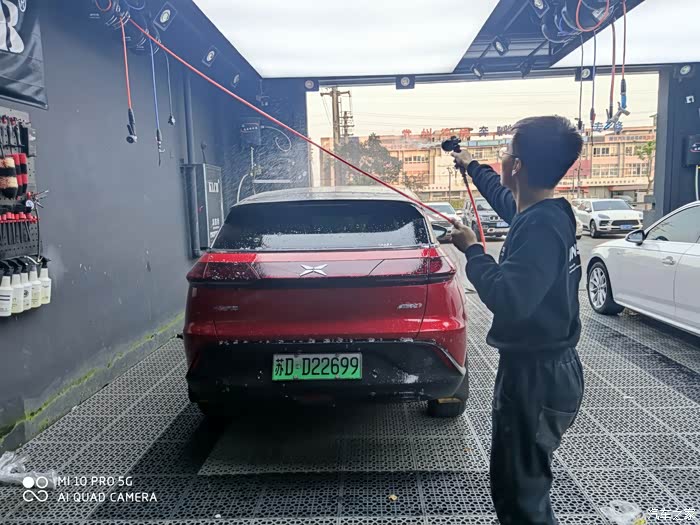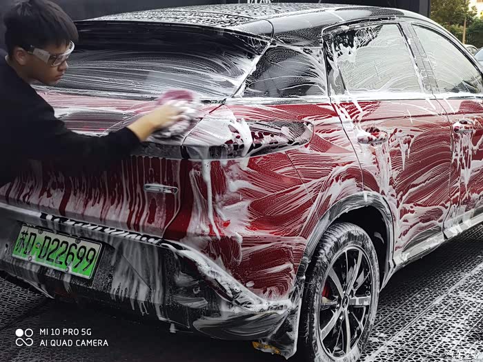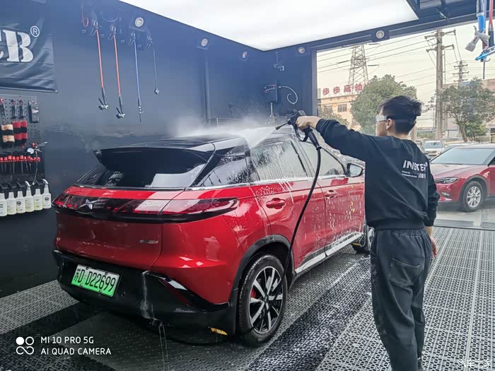 第二部分,外饰清洗作业。分成两部分,预洗?深度精洗。当时有点小纳闷,为啥要预洗呢,小哥说,为了保护车漆,先把车身表面的颗粒杂质冲洗掉,后面精洗时,有利于保护车漆,原来如此啊,👍🏻