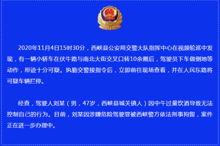 2020年11月4日15时30分,河南省南阳市西峡县公安局交警大队指挥中心在视频轮巡中发现,有一辆小轿车在伏牛路与南北大街交叉口转10余圈后,驾驶员下车做倒地等动作,形迹十分可疑。执勒交警接指令后,立即前往现场查看,并在人民东路将可疑车辆拦停。