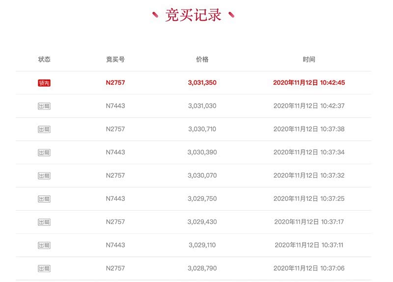 根据司法网拍规则,此次拍卖活动设置延时出价功能,在拍卖活动结束前,每最后5分钟如果有竞买人出价,将自动延迟5分钟。原定于12日10时截止的拍卖,共经历120余次延时出价,最终于12日10时47分叫价定格在3031350元,拍卖结束。