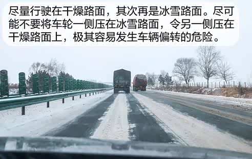 干燥路面上冰雪较少,车轮不易出现突然的打滑。在高速公路行驶时,切勿将一侧车轮在干燥路面上,另一侧在冰雪路面上,导致两侧车轮摩擦系数不一样,给油或制动很容易发生侧滑产生危险。