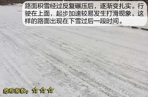 路面积雪未被清理,行人车辆反复碾压。积雪只会被压实,路面越来越滑,车辆快速起步将会打滑,同时制动距离明显增长。这样的路面易出现在巷子、郊区非主干道、乡村道路等道路上。在这些路面上驾驶,切忌急打方向与大脚油门,稳定方向和油门还是能安全行驶。