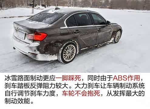 现在车辆基本上都配备了ABS防抱死系统,即使大力踩刹车车轮都不会严重抱死,ABS将会保持滑移率在20%附近。同时车辆都配有EBD制动力分配系统,可以让车辆的制动作出适当的分配。因此,在冰雪路面制动时可大力踩下,ABS便马上工作,从而获得最大的制动效果。