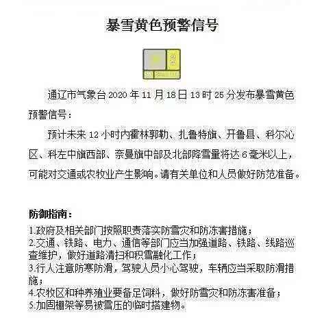 11月18日内蒙古自治区气象局发布暴雪黄色预警,预计未来12小时内霍林郭勒市、扎鲁特旗、开鲁县、科尔沁区、科左中旗西部、奈曼旗中部及北部降雪量将达到6毫米以上。