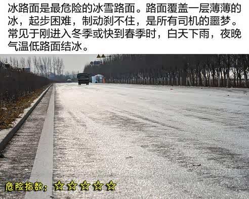 这种冰面路段通常是白天气温高下雨或雨夹雪,然后到晚上气温低了,路面上的积水就结冰了,一般出现在刚刚进入冬季以及快到春季的时候。遇到这种路况建议减少驾车出行。