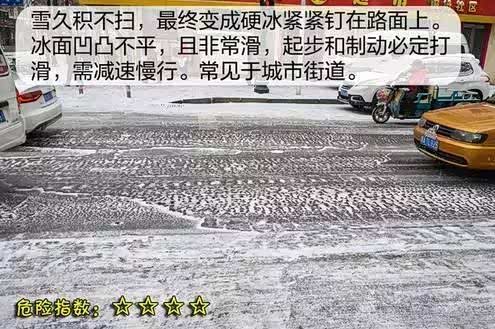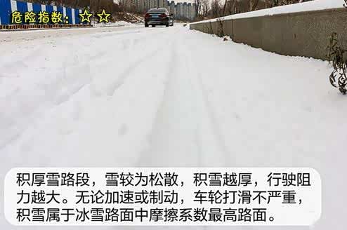 一般会出现在刚开始下雪时或没有及时清理的地方。路面积雪一般较为松散,车辆行驶阻力较大,行驶时会发出较大的声响。