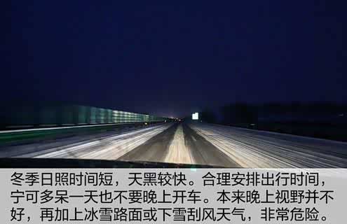 冬季日照时间较短,尽量避免晚上长途行驶。宁可多停留一天,也不要冒着晚上视野不好,路面积雪的路况驾车。因为平安才是最重要的!