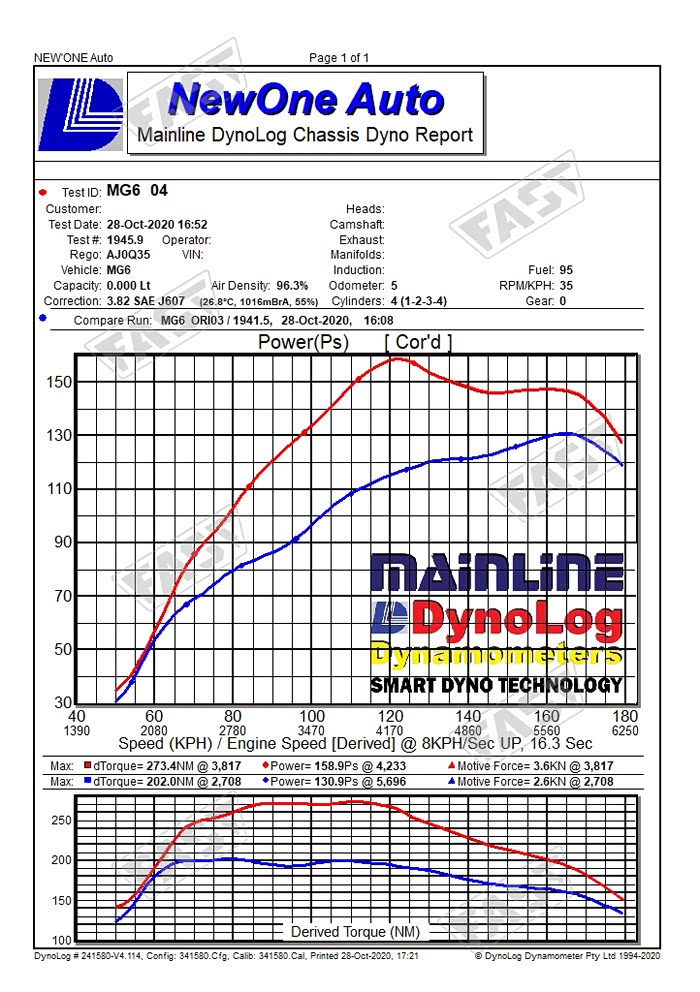 最终我们得到数据是原厂轮上130匹,202牛米,升级fast一阶段外挂后轮上158匹 273牛米。轮上提升28匹,71牛米,如果安装从发动机到轮上的损失率来计算的话发动机输出219匹(181:130=219:158)385牛米(285:202=385:273)。这样的输出的确以及堪比很多合资的高功率2.0T版本的发动机,当然在整体动力曲线上肯定是有很多差距,包括最大扭矩的转速区间。