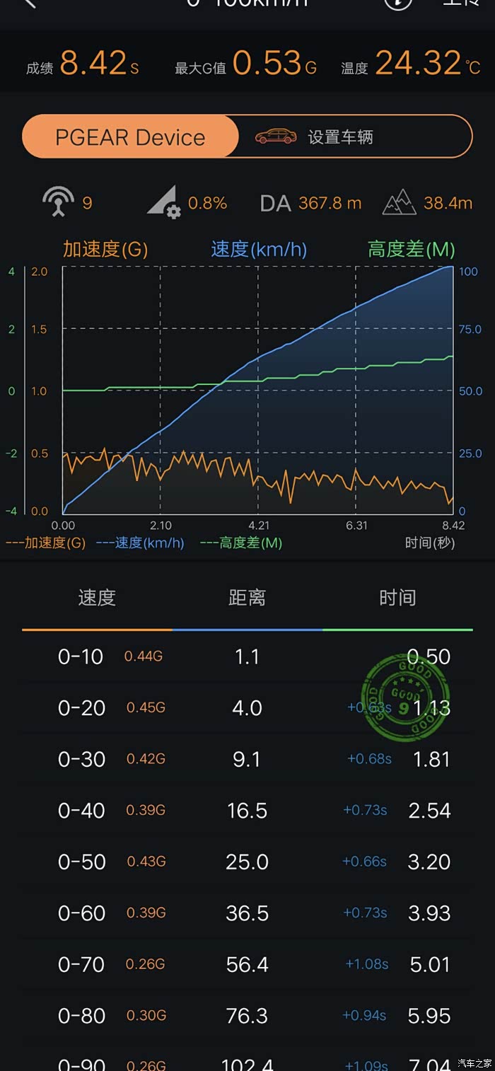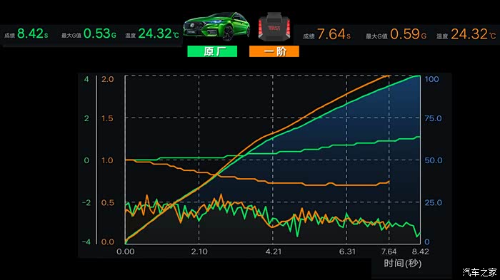 最终测得最佳原厂成绩8.42S,最大加速G值0.53。
