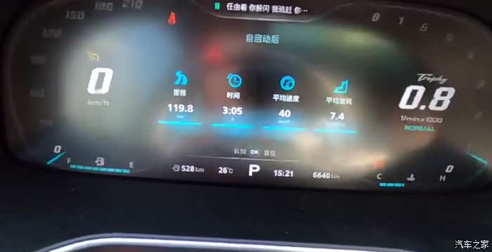 最终行驶120公里,高速占据1/3市区路况2/3,平局时速40公里每小时,表显油耗为7.4,此刻公里数为6640,最终我们加油8.45L。