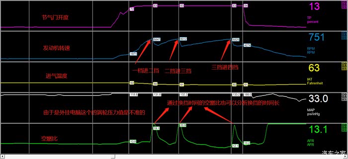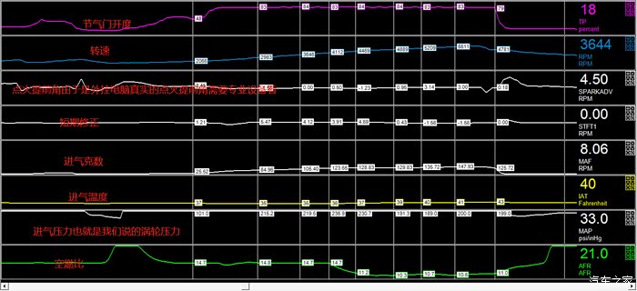 从这张数据流可以得出后段空燃比还是浓,而且三代MG6是全闭环的,可以从后段的短期修正分析得出,外挂想要把数据做得更加的完美还是需要调节前氧传感器的数据,才能改变全闭环的数据。(马力极限输出的空燃比为12.5),由于是外挂电脑调节,此处的点火提前绝不是准确的数据。