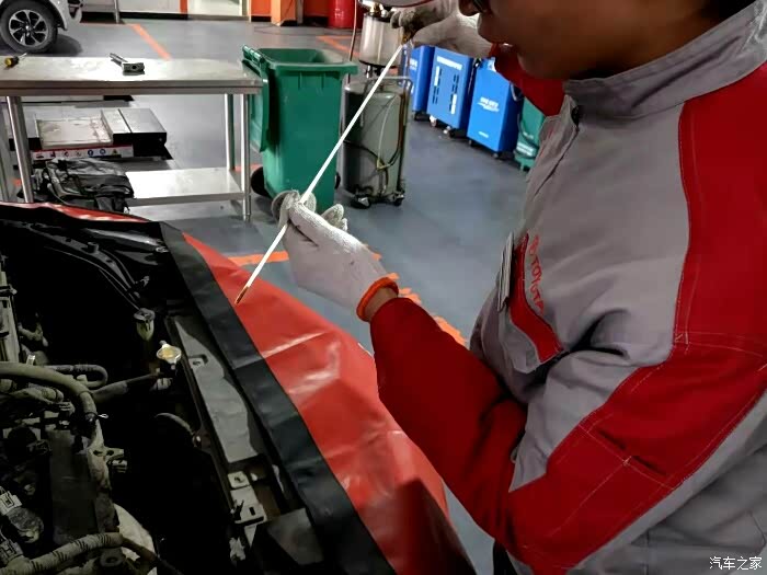 因为这几回保养觉得机油加到中线车跑着更溜,所以这回机油尺子拉出来,还是在中线靠下一些。