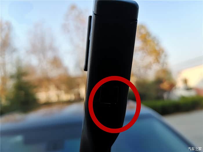 在取下时,用手指按住我标记的那个四方的小按扣,往里按,再把雨刷往上拔出就可以了。