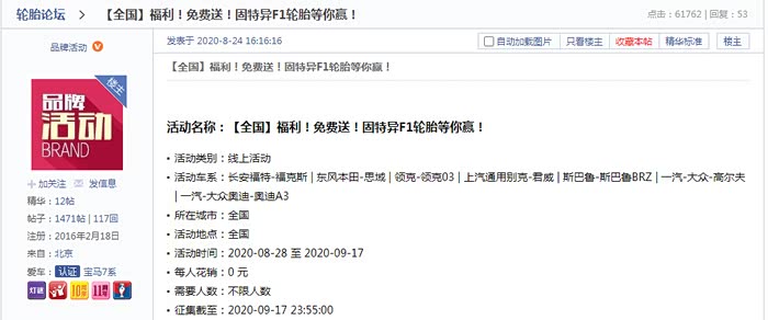 第一次参加汽车之家论坛的活动,非常荣幸获得固特异赞助的四条轮胎,作为固特异新开发的品类,这次的固特异鹰驰F1酷跑型号轮胎突出操控,抓地的性能特色。