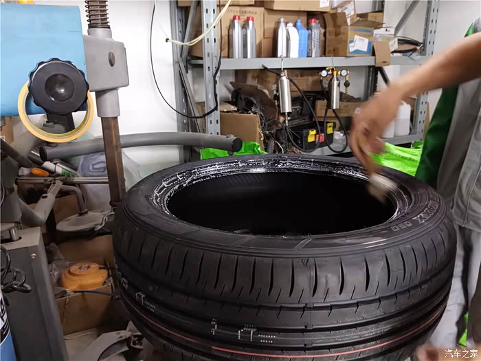 在新胎上刷上一层润滑剂,一会安装轮胎好安装。