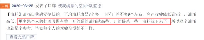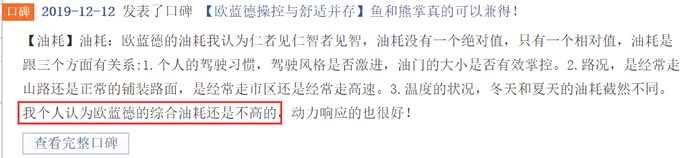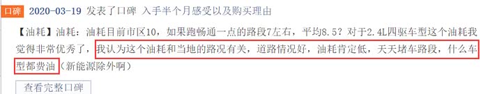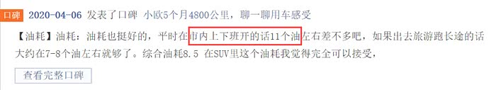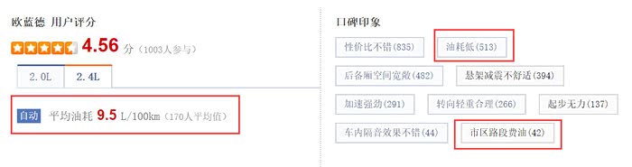 汽车之家170人参与评分的平均油耗是9.5L/100km,口碑印象里,参与人数1000人左右,关于油耗的评价有两个,一个是“油耗低“,另一个是“市区路段费油”。而恰恰,“油耗低“入选最满意口碑,占51%,“市区路段费油”入选最不满意口碑,占4%。