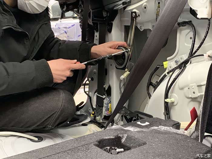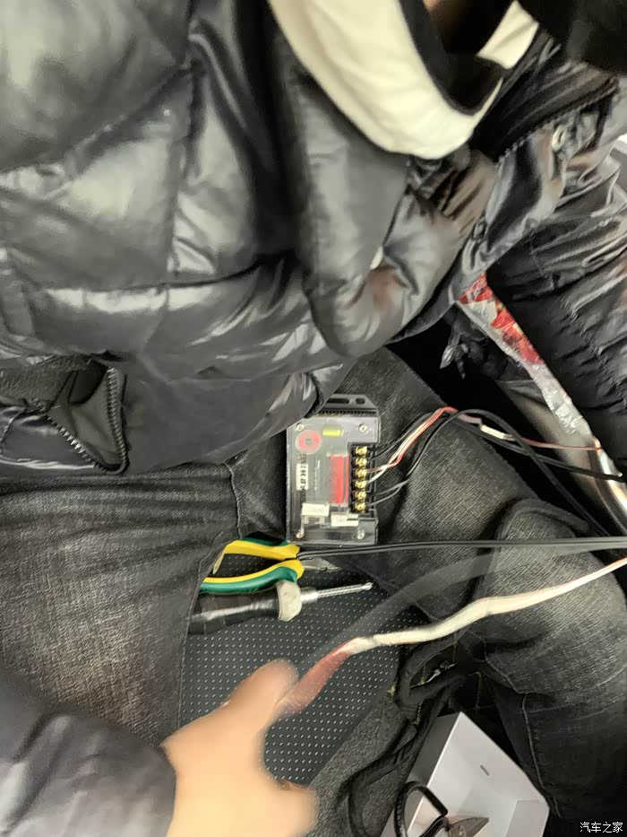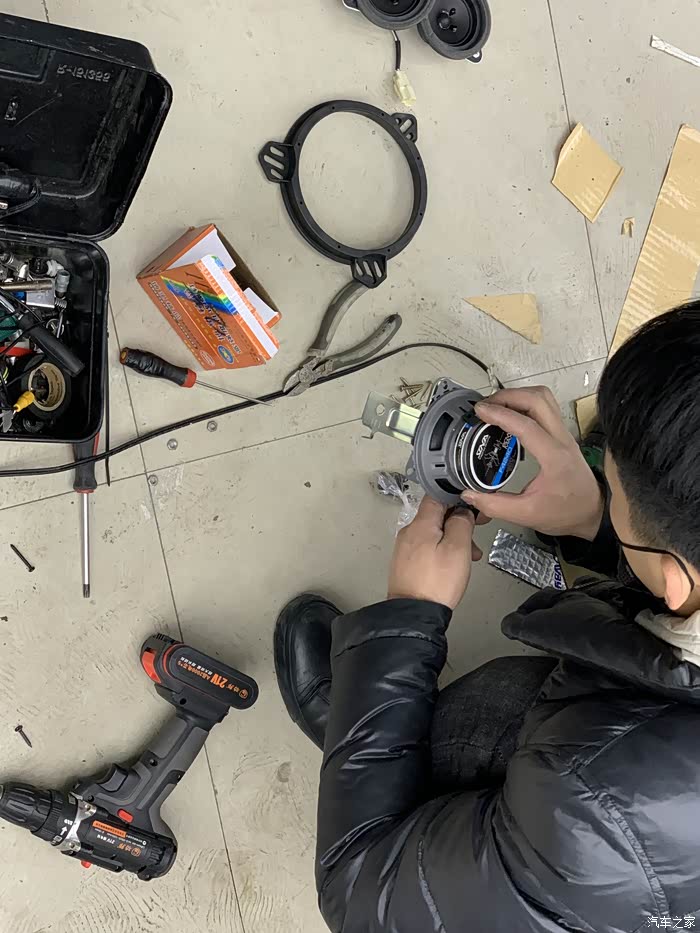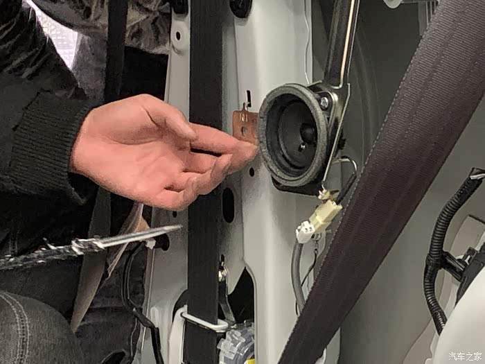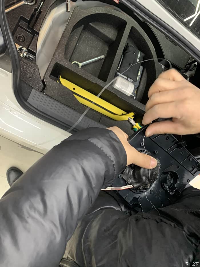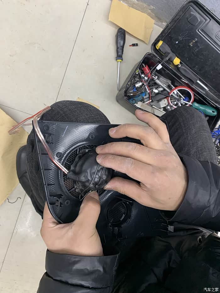 我笑了 这个高音喇叭 装不进去 大 没办法 师傅研究了一下 拿铁丝固定住了 然后怕有杂音 拿了胶糊了一圈
