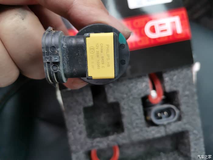3、把手伸进去把雾灯旋转半圈取下,换上LED雾灯插上,旋转半圈固定死。