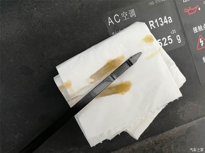 将油尺插入发动机再抽出,可以看到机油尺刻度,油液并没有减少,而且纸巾上的颜色不黑不重,说明对我的爱车使用此款黑钻级嘉实多机油还是没问题的!