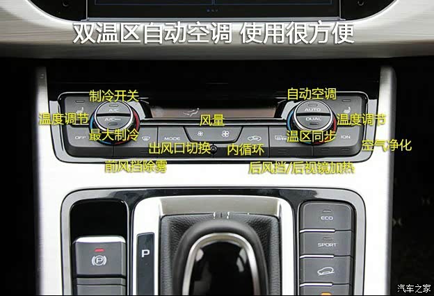 启动空调,按下A/C制冷开关,可以手动调节温度、送风模式,内循环等设置。也可以选择自动空调模式,无需再有多余的操作,更加方便。在手动状态下按 AUTO按键,风量大小、出风模式、进风方式会自动调整到适合当前车内温度的状态。处于内循环时指示灯亮,可以实现空气在车内的内循环,这样有利于迅速冷却车内空气和防止外界空气和异味进入车内,内循环使用一定时间后要切换到外循环运行一段时间,然后再切换回来已达到换气效果。按DUAL按键会在双区和单区模式之间切换,照顾不同人的需求。在雾霾天气的时候还可以按ION按键,启动博越的空气净化器,这也是博越的一大卖点,保护我们的健康!