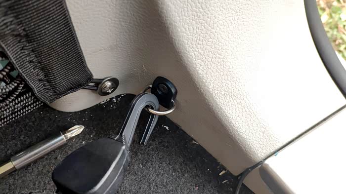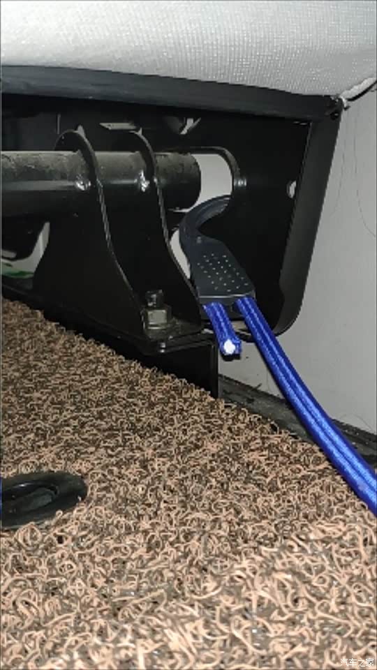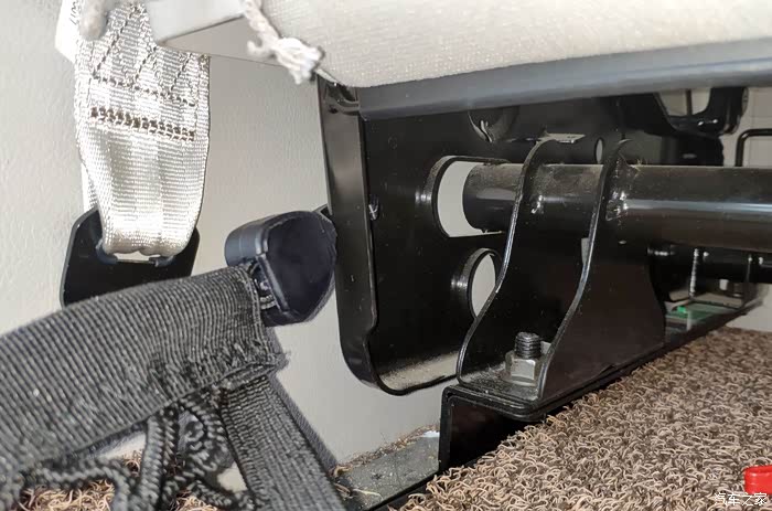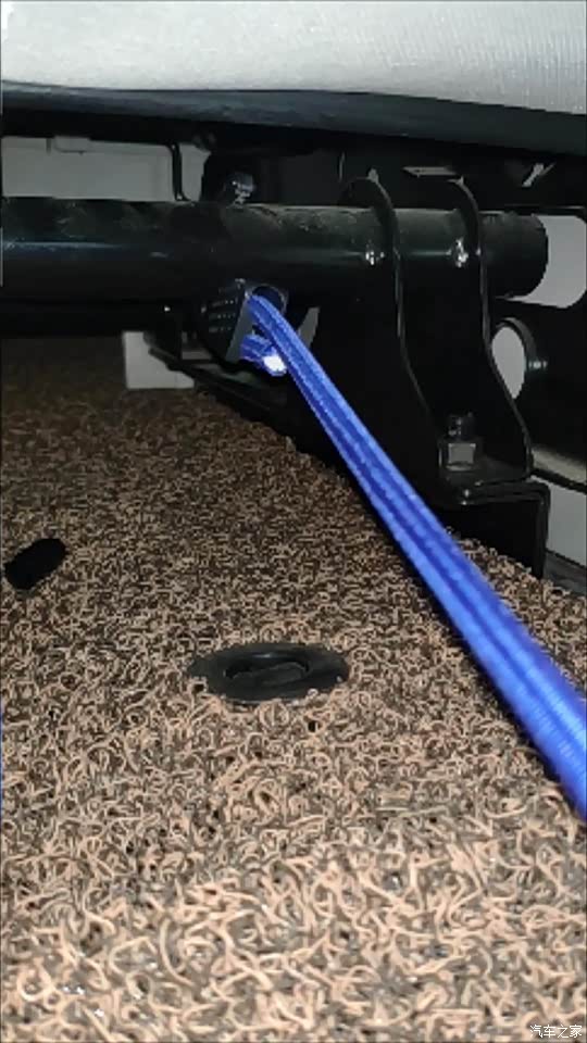 另一端,有两种用法。一种是后备箱东西很少,也不太高,仅是防止物品四处滚动就行的情况,这时候,挂钩直接勾到后排座椅下边固定架的孔洞里就行。