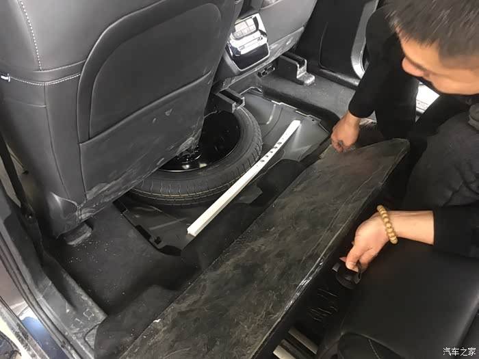 最后来看一下备胎,在第二排乘客脚下的前部,在扶手盒的正下方,不仔细找还真不知道在这藏着呢!