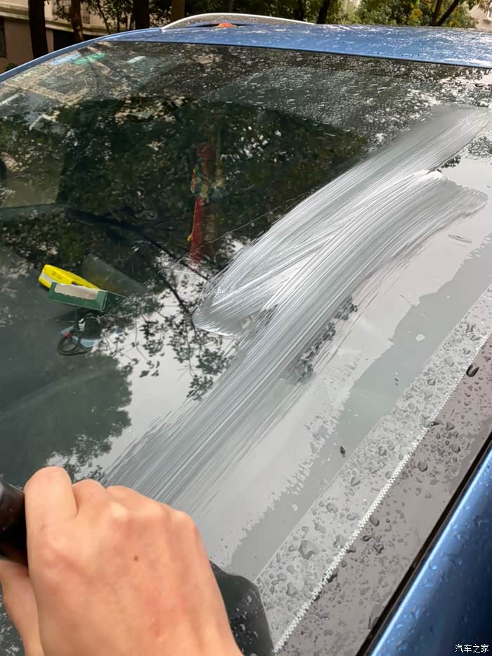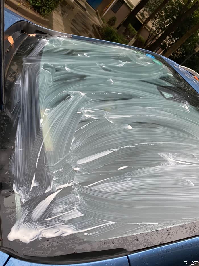 先用水冲干净玻璃,然后挤出清洁剂涂上去,乳白色液体,仿佛给前挡玻璃做面膜。