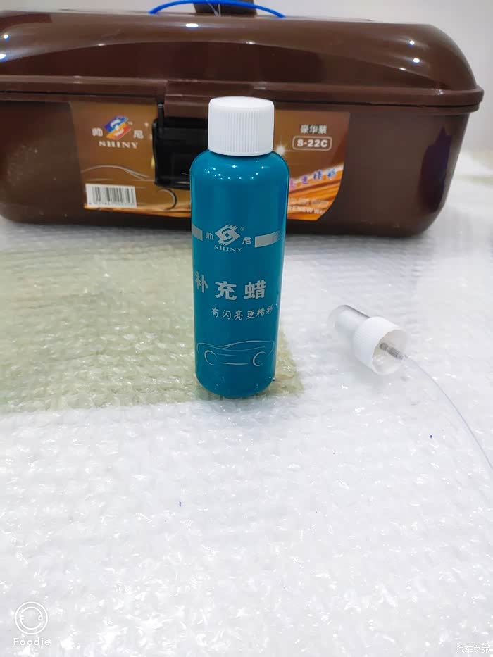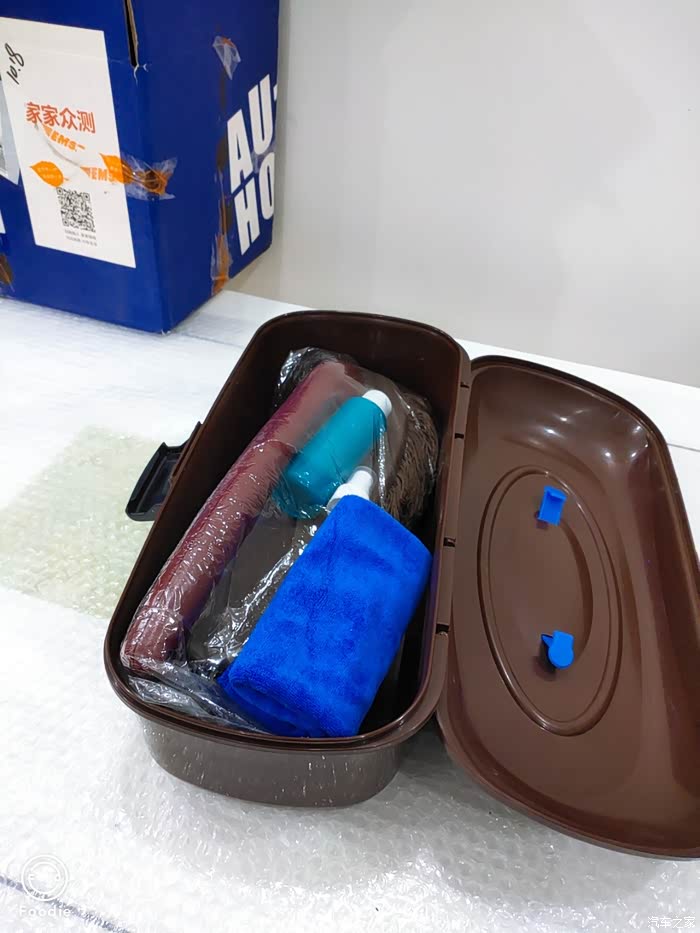 盒子里包括有除尘禅子,一条细绒毛巾和一瓶液体车蜡。