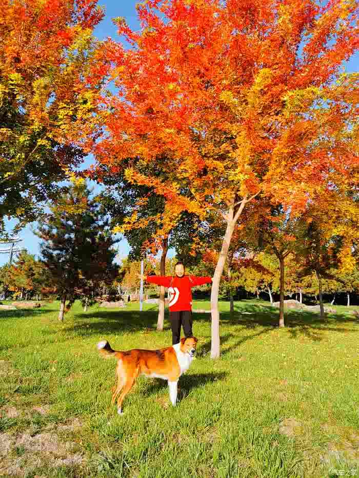 爱人带我家大黄枫叶树下留影。