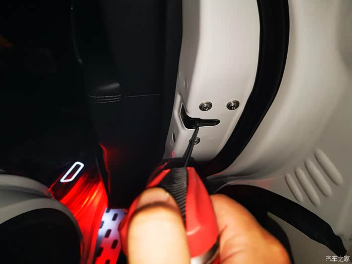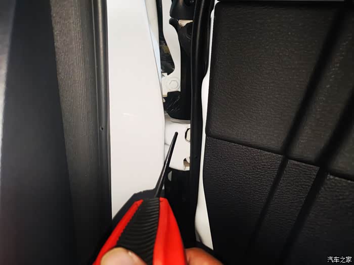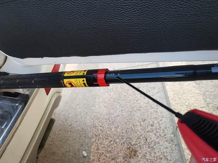 就是这个红色的卡环内部有个橡胶套一样的东西 开关门时,细杆来回伸缩摩擦发出的声音,对准卡环喷射车窗润滑剂并来回推动尾门,充分润滑后声音消失。观察3天没有复现,故障解决。