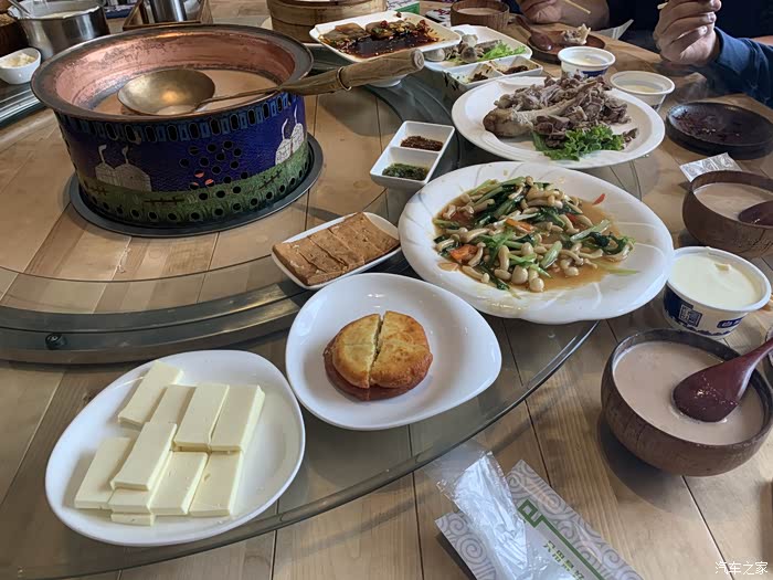 锅茶,今年流行的梗,秋天的第一杯奶茶。我这就豪横了,人家论杯,我这是论锅,我这还是小锅,牛奶普洱熬制的奶茶,加了一点点奶制品奶皮子奶酪等等、还有炒米和一点点盐。一顿饭下来,尤其是外面很冷的情况下,一碗热奶茶下肚,舒坦的不能再爽了。羊杂汤特别推荐,不像在北京喝到的有芝麻酱等很重的佐料味儿,这儿,真真儿是没加味道重的佐料,喝的就是羊杂原汁原味的味道,不膻,味道鲜美,而且凉了和都好喝!