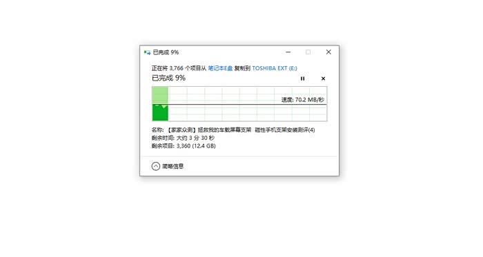 拷贝单个2GB大小的视频文件拷贝时间为二十秒左右,大小为19.1GB的照片碎片文件拷贝时间为三分钟零八秒,这个速度还是比较流畅比较快的;