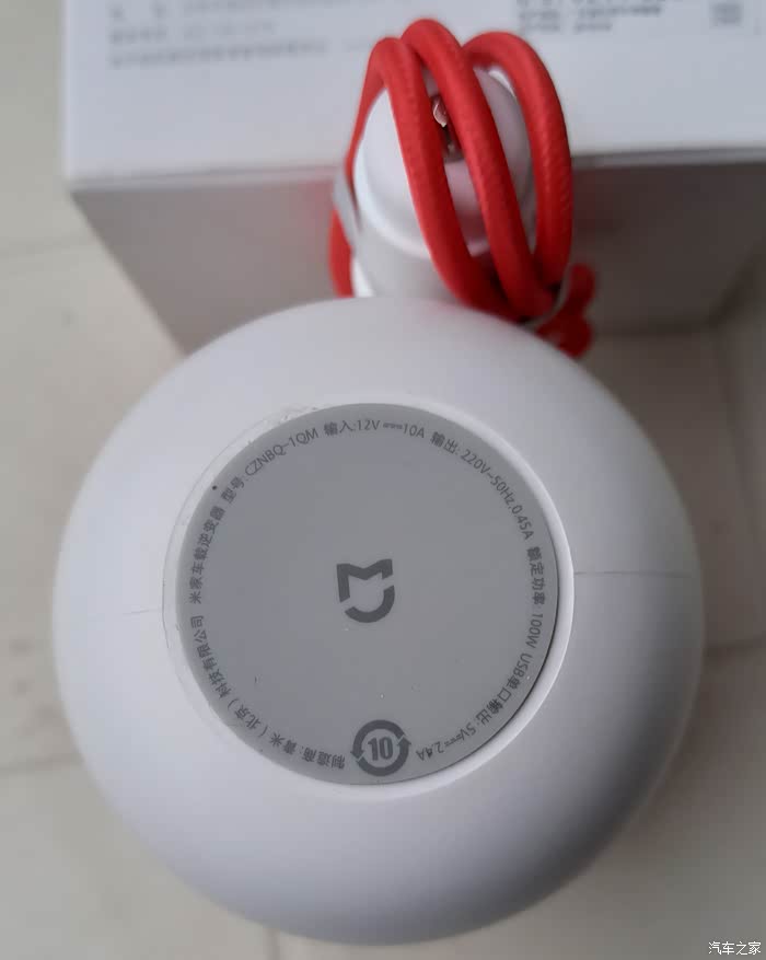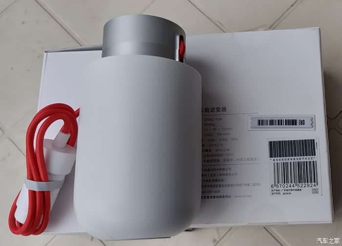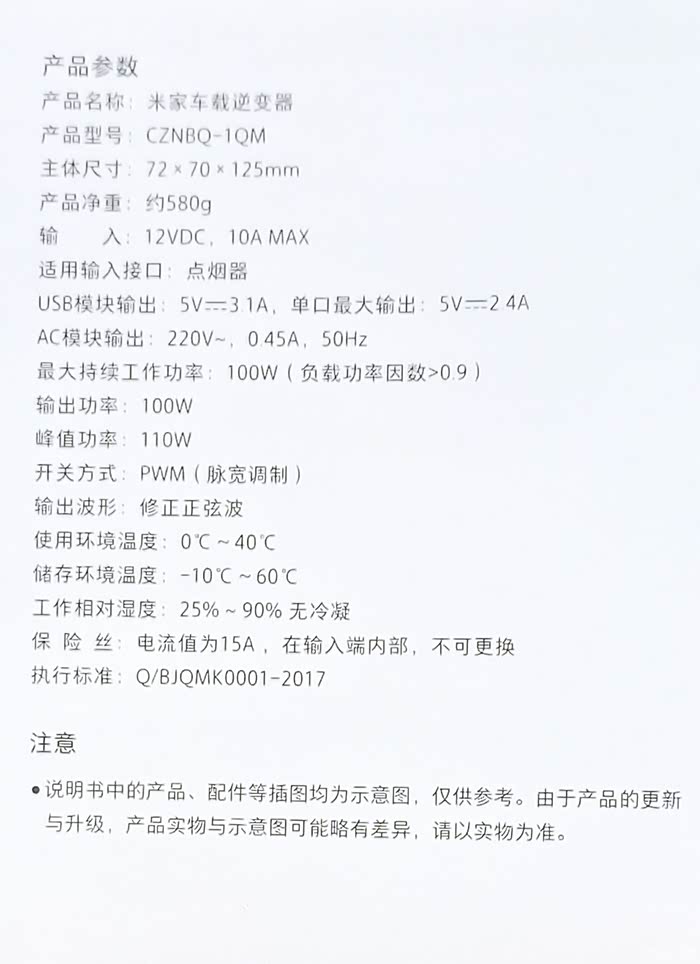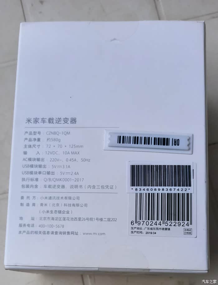 小米(MI)米家车载逆变器产品的外包装标签和产品标准。
