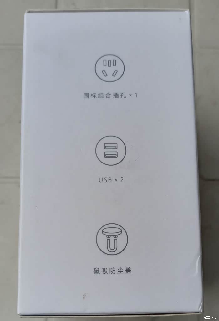 包装盒的侧面图案,产品包含220V电源插座和USB的插座。