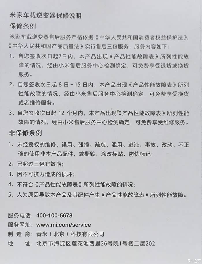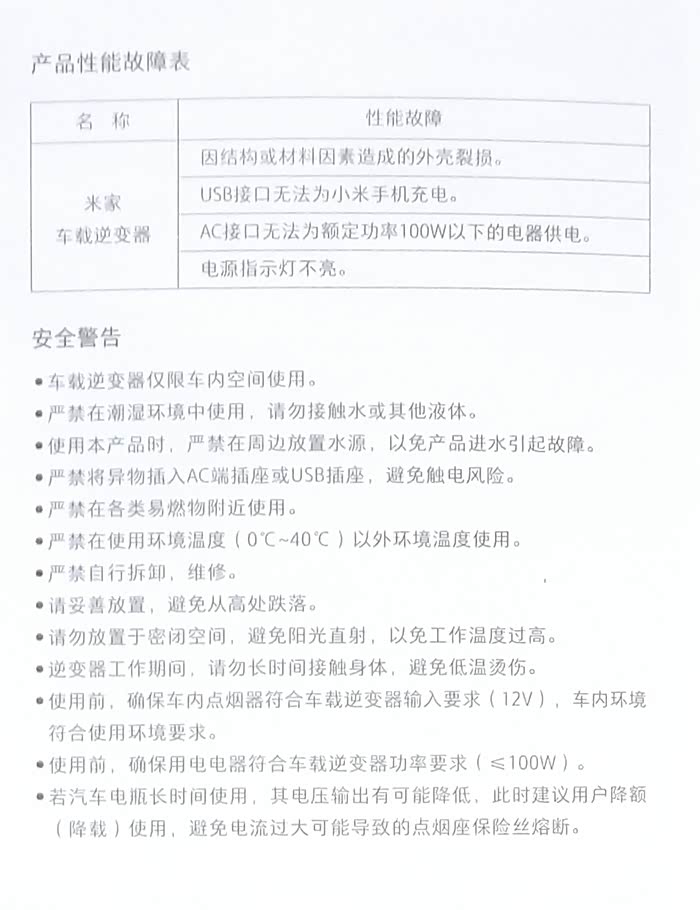 米家车载逆变器220V电源插座和USB的插座的保修说明,产品是在北京生产的。