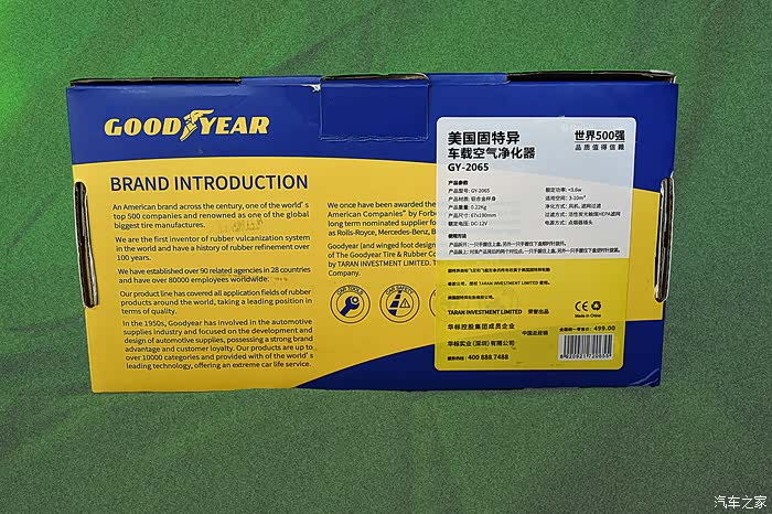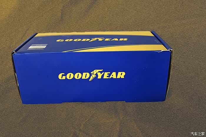 大号板砖样的包装盒,GOODYEAR的LOGO十分醒目。整个包装沿用固特异经典的蓝底黄字图案,好辨认。