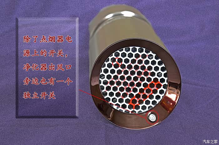 除了点烟器电源上的开关之外,出风口旁边也有一个独立的开关,当车载净化器工作的时候,开关旁边的指示灯就会亮起。
