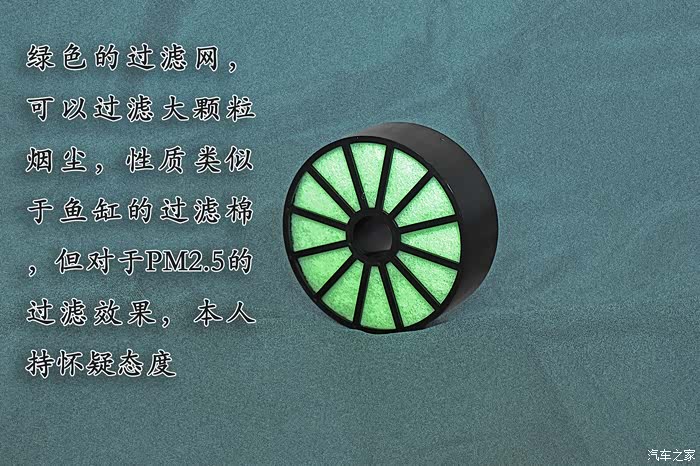 作为车载空气净化器与家用净化器还是有本质区别的,算是家用版的简易版本。毕竟体积,功率等都存在着较大差异。中间的这个滤芯也类似于鱼缸过滤的简易程序,算是过滤效果的初级版本。