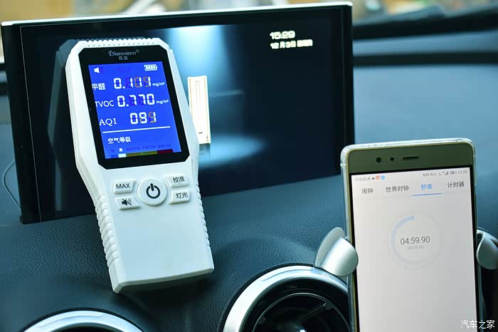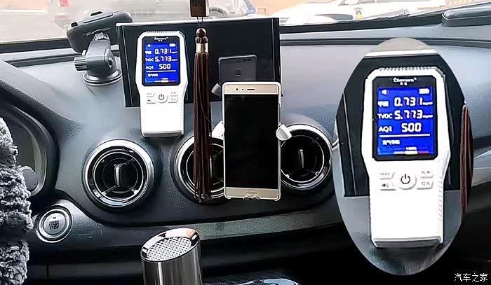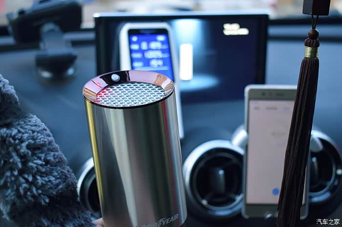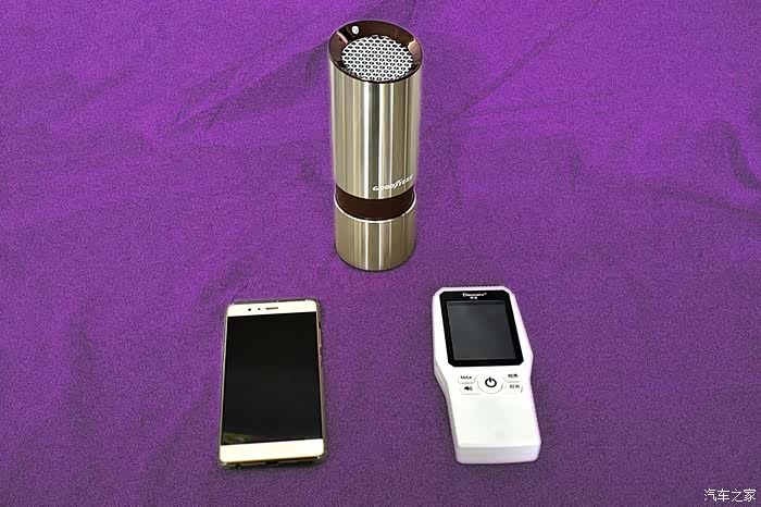为了验证固特异车载空气净化器的净化效果,借助于手机及空气检测仪。